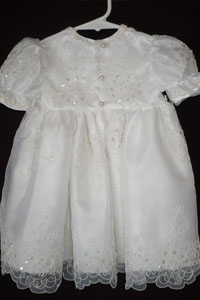 This sweet dress is a shorter version of some of my other gown. The dress is made of pure white satin and is adorned with organza lace with, pearls and sequin appliqu�s. Three, silk rose buds with ribbon streamers, and pearls are on the empire waist of dress and matching lace bonnet. Pearl cluster buttons complete this elegant dress. The dress has soft sateen lining for your baby�s comfort.