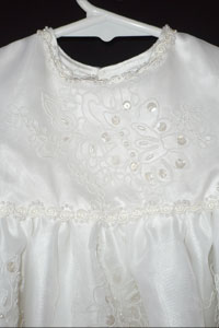 A child�s christening is a joyous event. It celebrates new life and new beginnings. A hand crafted one of a kind Heirloom Christening Gown or Romper by me will be cherished and passed on from one generation to the next. Each gown or romper is carefully stitched using high quality polyester matte satin, nylon, knit, and silk satin. The finest in trims of Venise lace, sequins and pearls, which is handcrafted down to the tiniest detail.