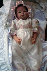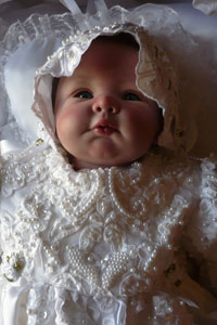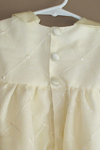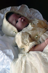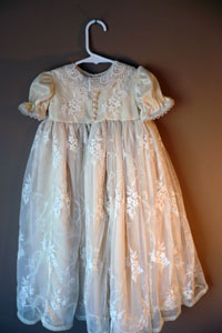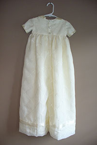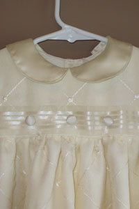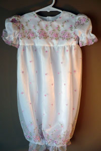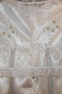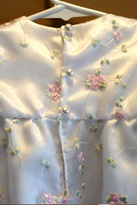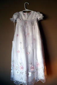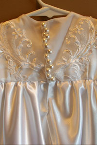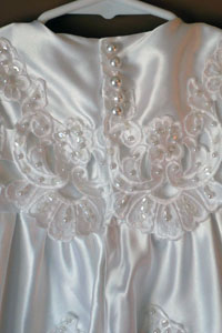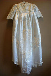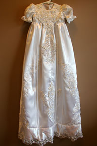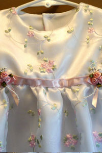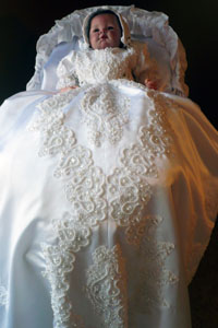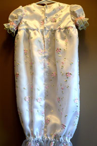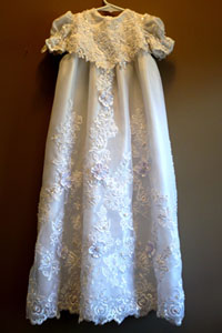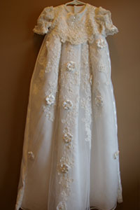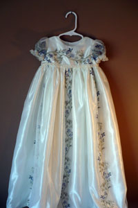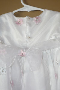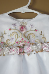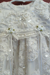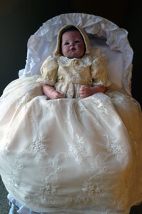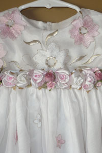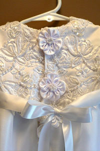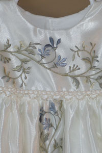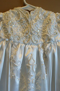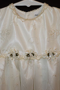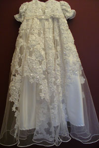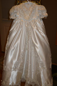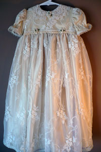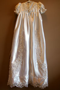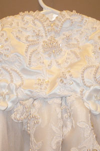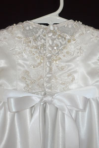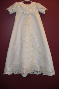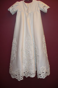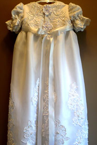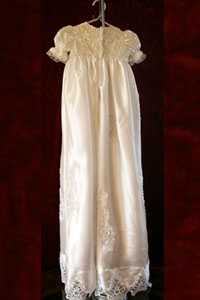 This gown was made especially for Madeleine, who will be Christened on Labor Day 2008 with her sister Nora. Gown is made entirely of silk. The gown�s bodice and capped sleeves are adorned with beautiful embroidery of pearls and sequins. The gown has a sheer embroidered overlay of lace, with satin flower appliqu�s, with light netting for fullness. The back of the gown has snap closure with Flower appliqu� buttons, and a satin ribbon tie. The gown has soft sateen lining for your baby�s comfort.