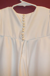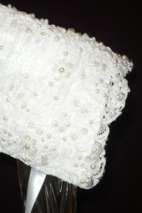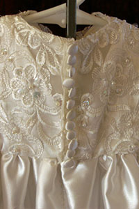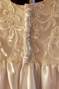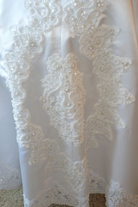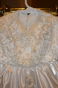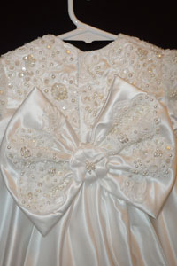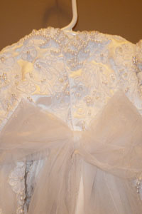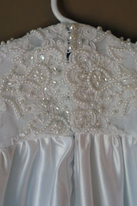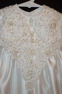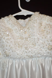 This sweet dress is a shorter version of some of my other gown. The dress is made of pure white satin and is adorned with embroidered lace, pearls and sequin appliqu�s.