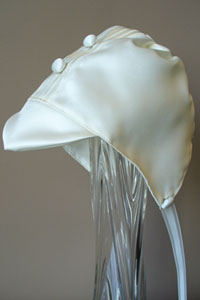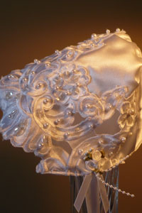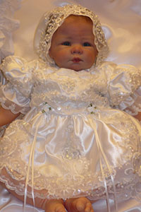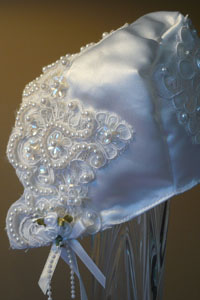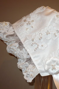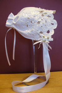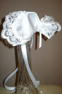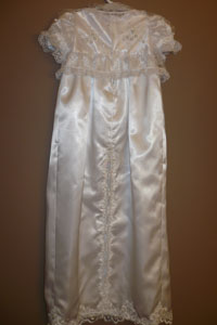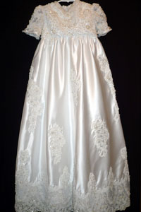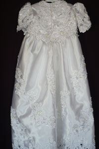 Gown is made of white silk satin with an organza embroidered overlay lace. Trimmed with satin flowers at the bodice that are removeable, Gown has a organza tie in the back, and neting for the beautiful full gown look. The gown has soft sateen lining for your baby�s comfort. Snap closure with pearl buttons in back. Matching lined bonnet included.