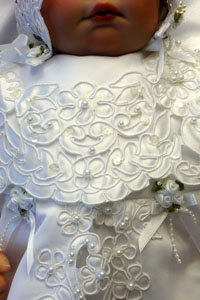 Beautiful intricate satin cutwork accented with cording sequins and pearl creates a truly incredible christening gown. Pearl cluster buttons complete this elegant gown. The gown has soft sateen lining for your baby�s comfort. Matching lined bonnet included.