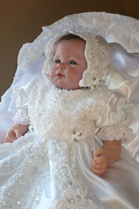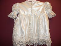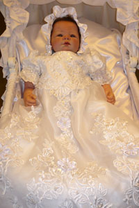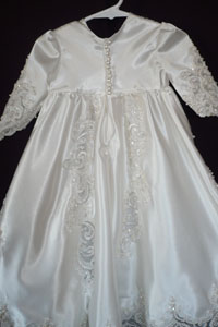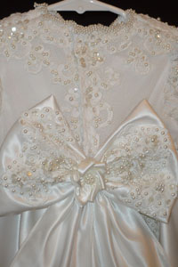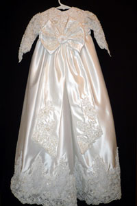 Bottom of gown is full lace of sequins and pearls. The back of the gown has a detachable satin bow. The gown has soft sateen lining for your baby�s comfort. Matching lined bonnet included.