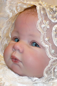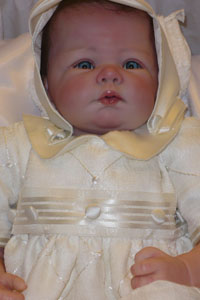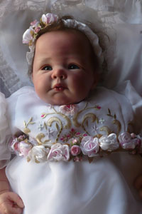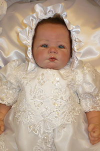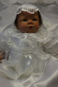 This precious special custom made gown is of stunning silk dupioni. It is beautifully embroidered with a V shaped bodice with long embroidered sleeves. The lace embroidery is generously adorned with pearls and sequins; there are three silk rose buds with ribbon streamers on the front of gown and bonnet. Gown has a lovely lace scalloped edge and beautifully embroidery appliqu�s with pearls on the center front of the gown. The back of the gown has snap closure with satin covered buttons and satin tie ribbon. The gown has soft sateen lining for your baby�s comfort. Matching lined bonnet included.
