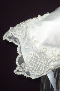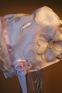 This elegant gown is made entirely of silk. The gown�s bodice and capped sleeves are adorned with beautiful embroidery of pearls and sequins. The gown�s fullness comes from its sheer embroidered overlay of lace netting, and flower appliqu�s. The back of the gown has snap closure with Flower appliqu� buttons. Matching lined bonnet included.