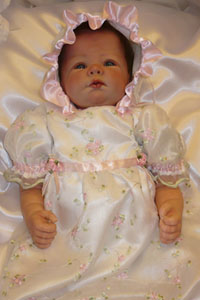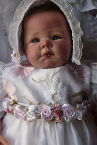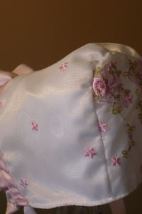 Three, silk rose buds with ribbon streamers, and pearls are on the empire waist of dress and matching lace bonnet. Pearl cluster buttons complete this elegant dress.