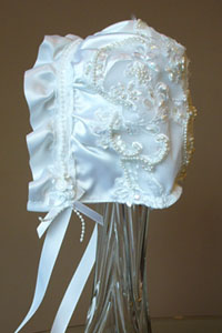 the, and matching bonnet. Pearl cluster buttons complete this elegant gown.