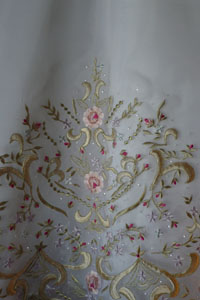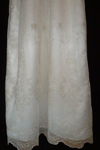 This beautiful gown is made entirely of silk. The gown�s bodice and capped sleeves are adorned with beautiful embroidery. The gown�s fullness comes from its sheer embroidered overlay of embroidered lace netting, with a satin cord trim.
