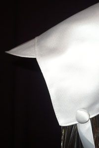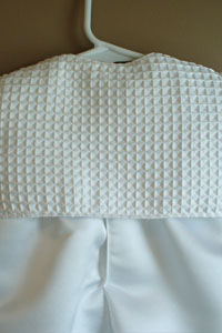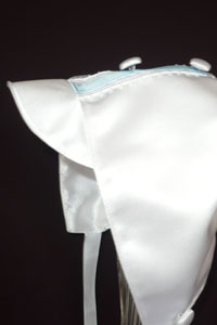 fabric trimmed with white and blue silk satin trim, with a soft sateen