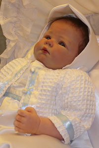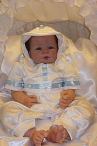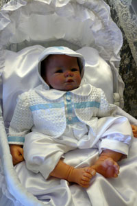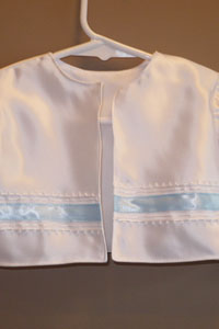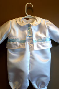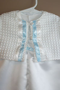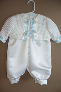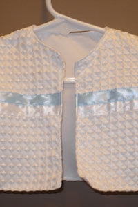 This outfit comes with a warm comfortable matching jacket trimmed with white and blue silk satin trim, with a soft sateen lining for your baby�s comfort. Matching lined bonnet included.