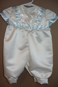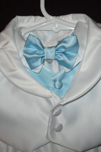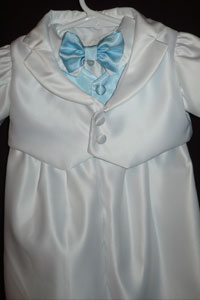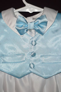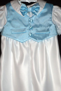This cute little tuxedo romper suit is made of white silk dupioni., with white tux jacket, and pleated white shirt with matching blue vest and bow tie, an added touch of a silk flower on the lapel. Romper has a soft sateen lining for your baby�s comfort.