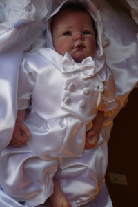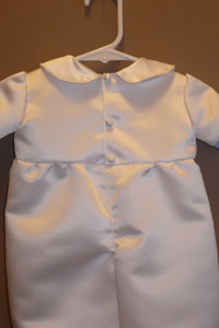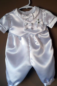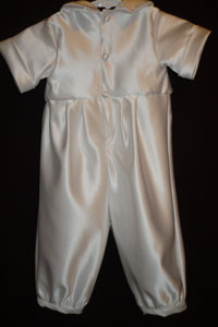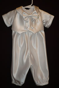 This cute tuxedo romper suit is made of white satin. Double vested with matching bow tie, an added touch of a silk flower on the lapel. Romper has a soft sateen lining for your baby�s comfort. Matching lined bonnet included.