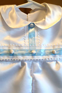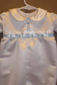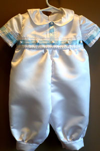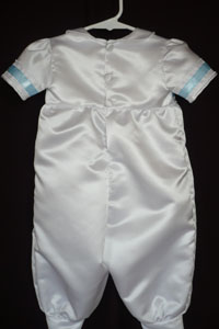 Your little man will look absolutely princely in this white silk dupioni romper with silk satin trim in white and blue and satin covered button trim on front.