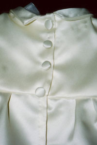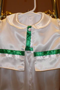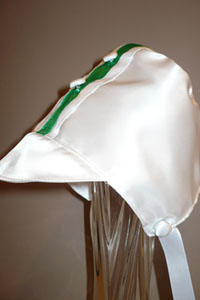 fabric trimmed with white and green silk satin trim, with a soft sateen