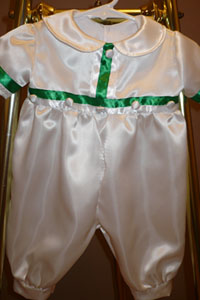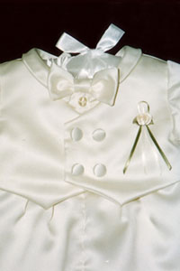 This cute little tuxedo romper suit is made of white silk dupioni. Attached pleated shirt and vest with bow tie, with an added touch of a silk flower on the lapel. Romper has a soft sateen lining for your baby�s comfort.